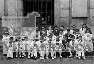 Comunión en la iglesia de San Pedro. Grupo de niños de la comunión sentados. en las escaleras de la