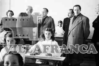 Visita de Ministro Fernández Cuesta. Yagüe, Valcárcel y Elola (en el extremo izquierda). Escuela Infantil de formación profesional Juan Yagüe. Formato: 35 Milimetros