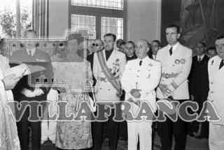 El Conde de Vallellano, Carmen Polo, Posada Cacho y Franco durante la inauguración de escuelas.