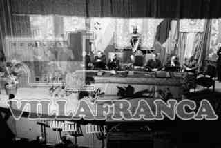 Acto en el cine Avenida. El General Yagüe, Díaz Reig y Rodríguez de Valcárcel, entre otros.