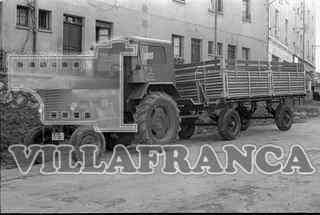 Tractor de la marca "Steyr" y remolque aparcados en un pueblo.