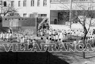 Niños y monjas en el patio durante el recreo. Monjas del Calvario