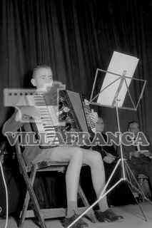 Fiesta en el Colegio Liceo. Niño tocando acordeón. Detrás, curas.