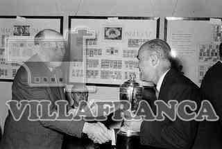 Clausura de la Exposición Filatélica. Hombre recoge diploma y copa