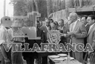 Premios a las peñas en Fiestas de San Pedro. El Sr. Plaza con un escudo de pan. A su lado, Arroyo. Alcalde Jaquotot