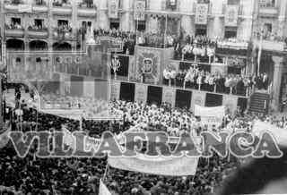 Franco en la Plaza Mayor, los asistentes portan pancartas de apoyo