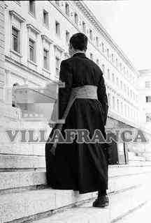Seminarista con sotana subiendo por las escaleras del Seminario Mayor de San Jerónimo.