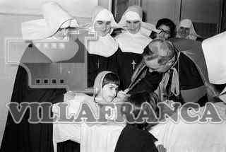 El obispo y algunas hermanas durante la visita de éste a los niños del asilo de las Mercedes