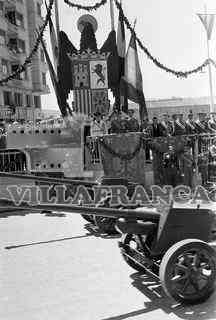 Desfile de la Victoria. Cañon frente a la bandera española del régimen franquista.