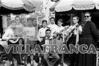 Banquete en la terraza del Bar David. Banda de músicos