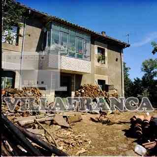 Casa con troncos de madera y gallinas a la puerta