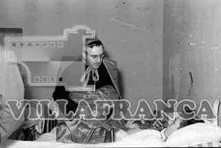 Visita del Gobernador. Hospital del pueblo. Cura sentado frente al enfermo.