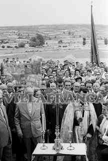 Multitud de habitantes de un pueblo en la visita del Gobernador Civil. Cura bendiciendo.