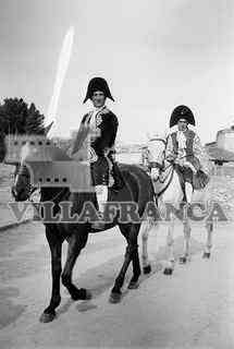 Charlotada de las Peñas. Hombres con trajes goyescos a caballo