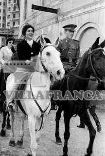 Mujer y militar montados a caballo al lado de la Plaza de Toros.
