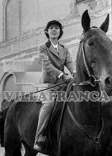 Mujer montada a caballo al lado de la Plaza de Toros.